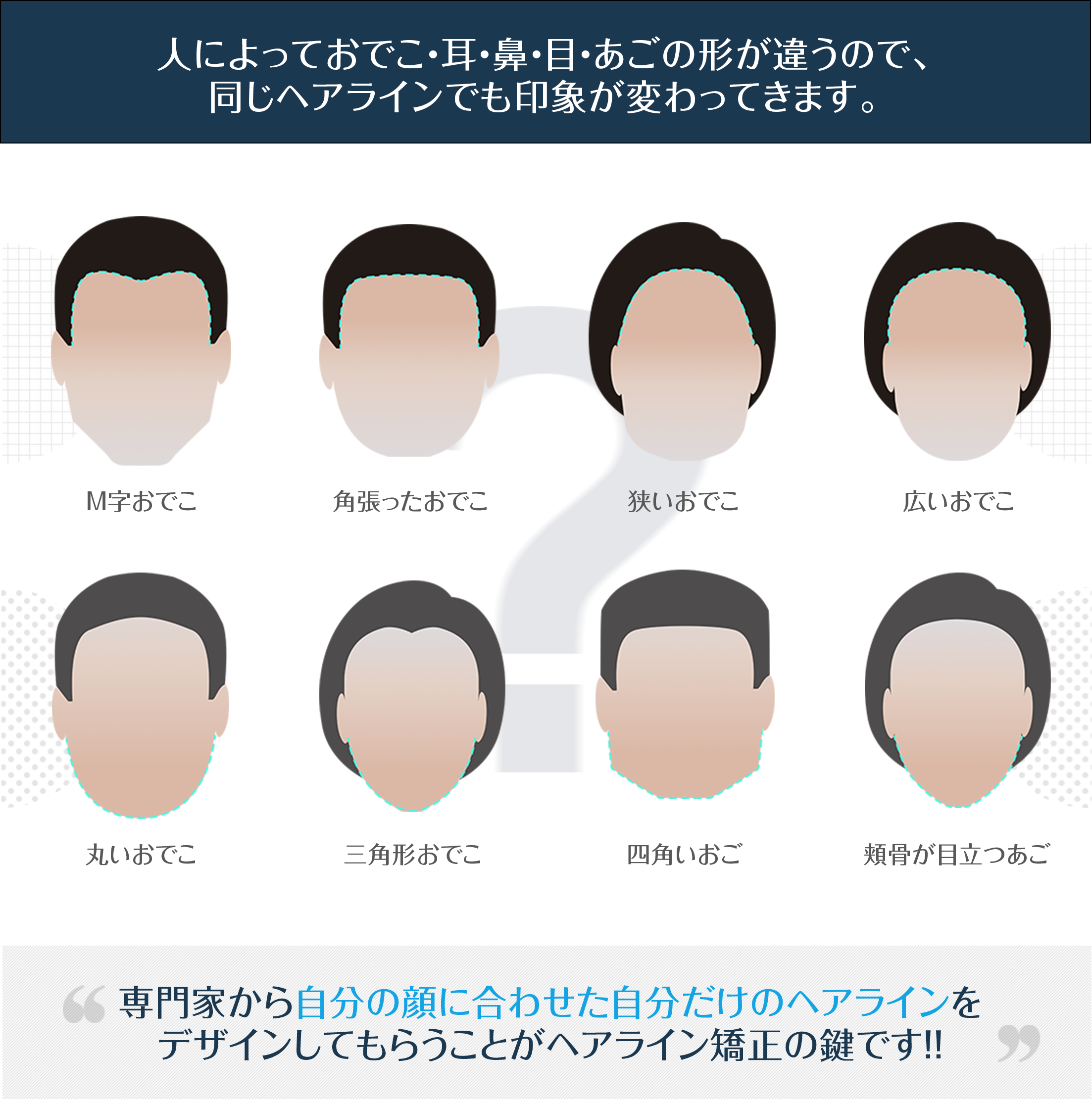 自分の顔の形に合わせた自分だけのヘアラインだからこそ美しいヘアラインになります。ですので、バランスを整えたオーダーメイドのデザイン(ヘアライン設計)が何より重要です。