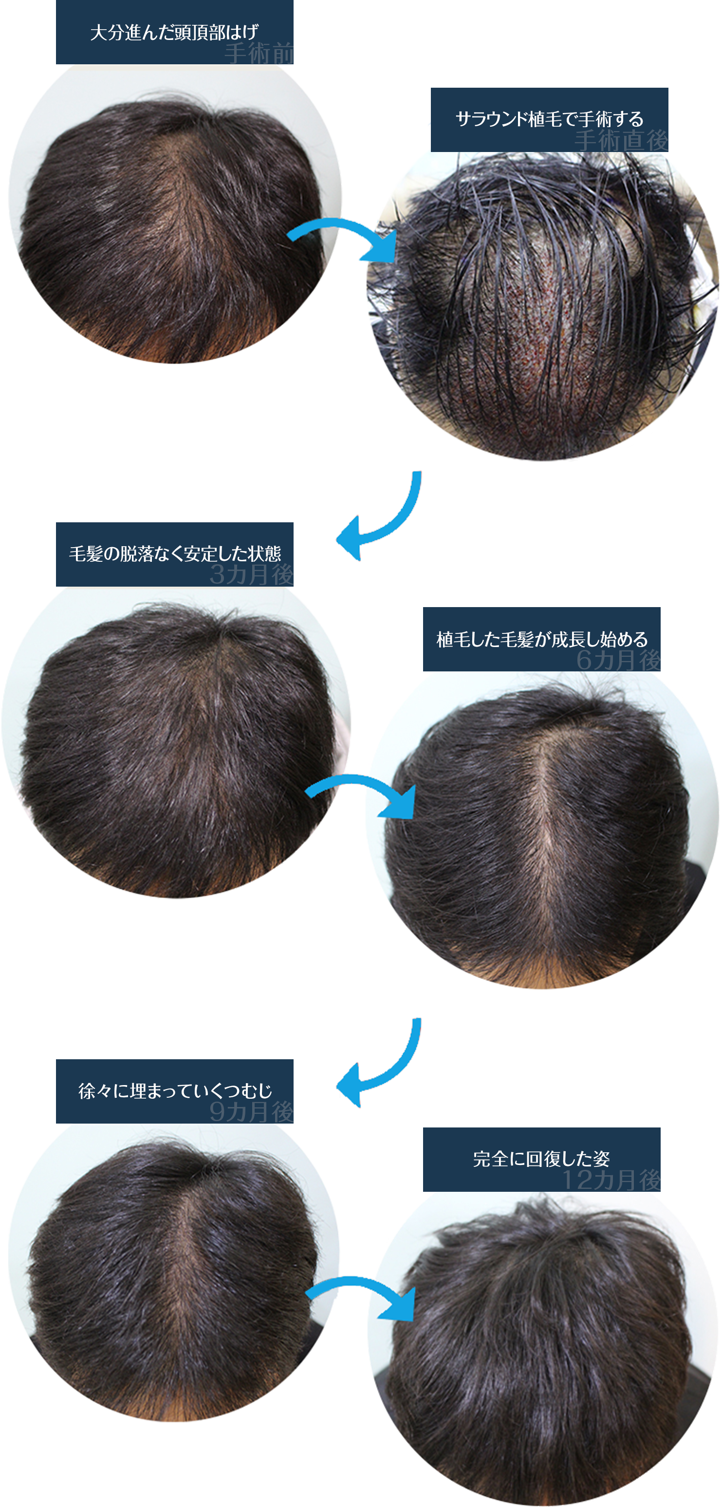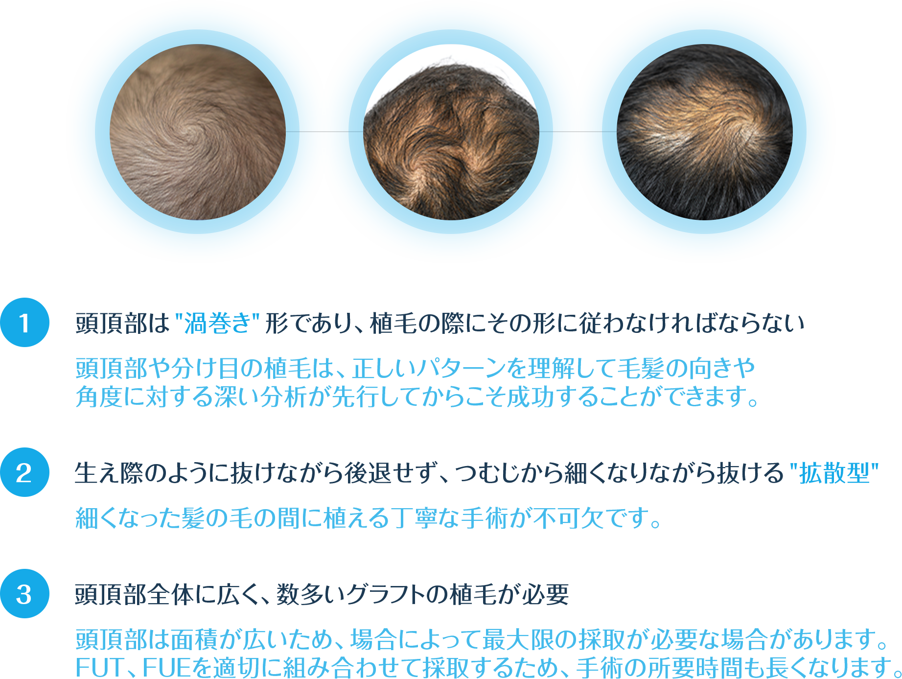 抜けずに全体的に細くなっていく頭頂部はげ、残った毛髪の間に的確な植毛して密度を補強する難しい治療が必須です。チャーム・ドクター医院独自のノウハウ「サラウンド植毛」で難しい頭頂部の薄毛を解決致します。